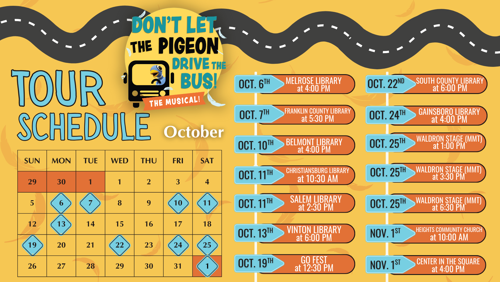 We are fully booked for Don’t Let the Pigeon Drive the Bus, but if you are you interested in Mill Mountain Theatre stopping by your school, library or business next year or joining us for a Student Matinee? Then sign up and we’ll notify you when we’re booking our next tour in 2026!